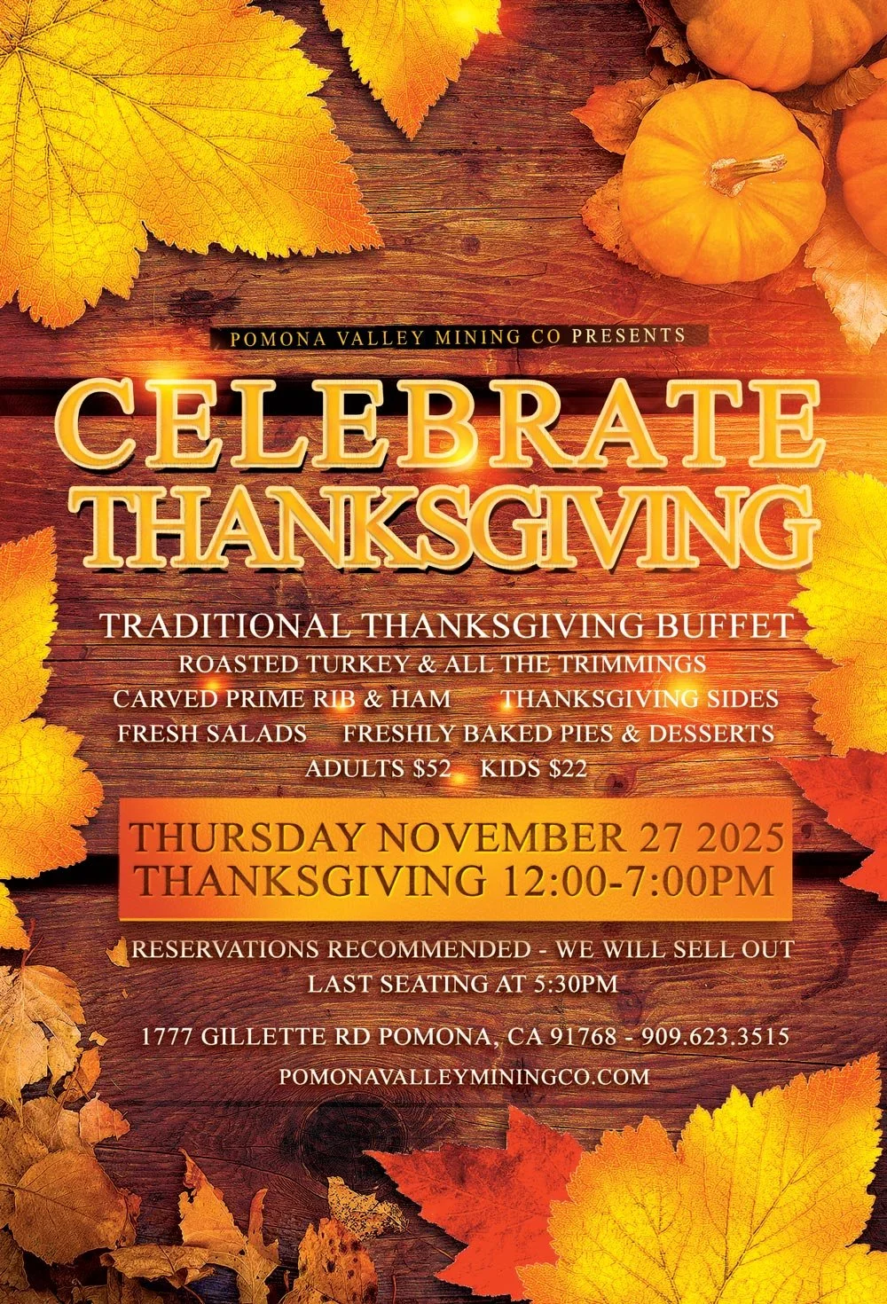 Pomona Valley Mining Co is proud to be open serving you, your friends & family with a beautiful Thanksgiving buffet experience featuring all of the traditional Thanksgiving dishes. Our iconic, hilltop restaurant and beautiful view of the Pomona Valley below compliment the fresh, hot food displays that have something for everyone in the family!