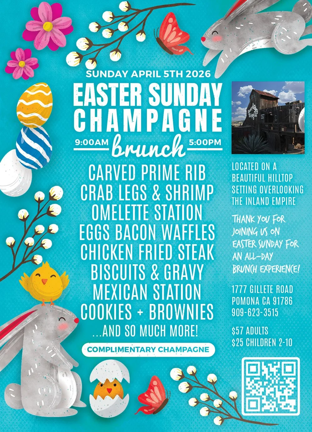 Pomona Valley Mining Co is proud to be open serving you, your friends & family with a beautiful Easter Sunday Brunch buffet experience featuring all of the traditional Sunday Brunch dishes + extra special items. Our iconic, hilltop restaurant & beautiful view of the Inland Empire below compliment the fresh, hot food displays that have something for everyone in the family!