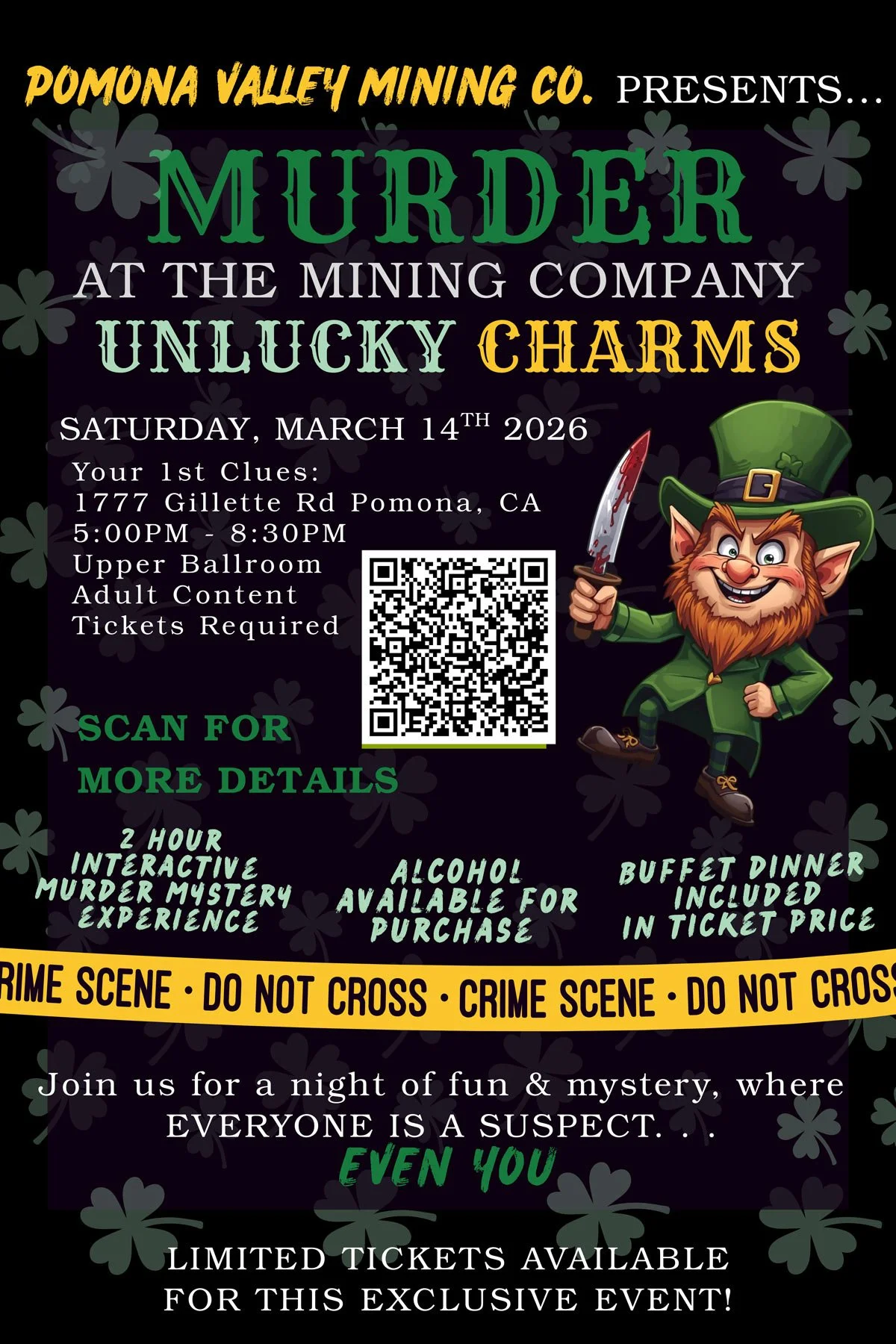Celebrate St. Patrick’s Day with us at Pomona Valley Mining Co with a special “Murder at the Mining Co: Unlucky Charms” where we encourage you to enjoy with us a 2 hour interactive murder mystery experience complete with a buffet dinner included!